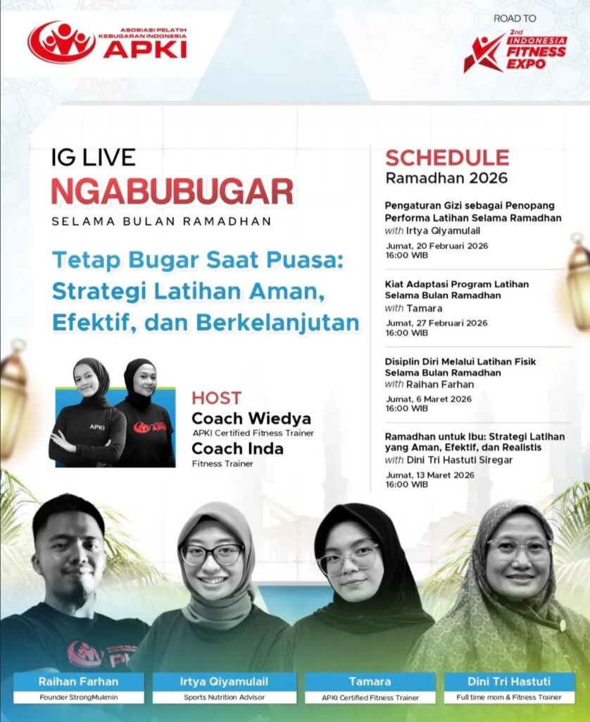 Selain aktivitas fisik, APKI juga menghadirkan rangkaian Ngabubugar IG Live yang berfokus pada edukasi kebugaran selama Ramadhan. Program ini diselenggarakan melalui Instagram Live APKI sebagai ruang diskusi ringan namun aplikatif bagi masyarakat yang ingin tetap menjaga kesehatan selama menjalankan puasa.