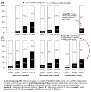 Artinya, 96% atlet senior internasional bukan atlet junior internasional sebelumnya. - Atlet tingkat nasional Junior A dan atlet tingkat nasional senior hanya 32% yang sama.